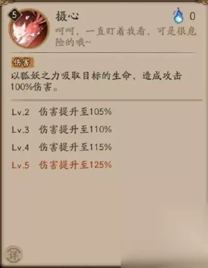本真三尾狐技能 普攻:摄心 伤害 以狐妖之力吸取目标的生命,造成攻击100%伤害。 Lv.2 伤害提升至105% Lv.3 伤害提升至110% Lv.4 伤害提升至115% Lv.5 伤害提升至125%