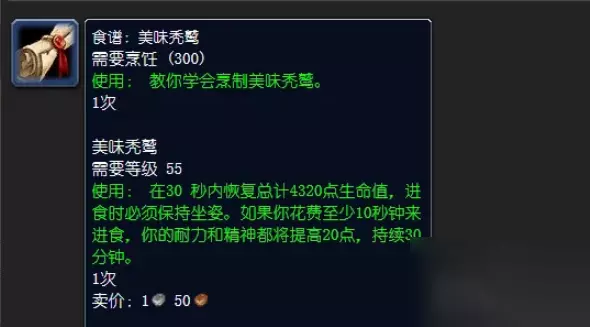 魔兽世界美味的秃鹫食谱怎么获得 食谱效果: 在30 秒内恢复总计4320点生命值,进食时必须保持坐姿。如果你花费至少10秒钟来进食,你的耐力和精神都将提高20点,持续30 分钟。