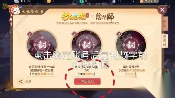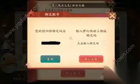 在梦幻西游三维版中,玩家只需在活动当中找到大妖降世这一栏,点进入之后选择阴阳师,就可以进行绑定了。 阴阳师: 阴阳师当中的绑定码就比较好找了,直接在活动页面当中就可以看到通过绑定来获取积分,从而开启绑定页面。 个人建议: 当然比起玩家自己和自己绑定,其实找到本来就在游玩梦幻西游三维版的玩家,联系好申请互相绑定是最好的。这样阴阳师的玩家和梦幻的玩家都能够通过对面的活跃来享受到联动活动的奖励,同时还可以节省自己的时间。