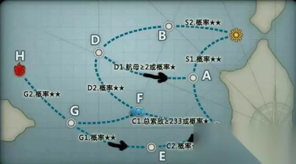 带路条件: 1、起始:起始→A★★;起始→B★★ 2、C点:舰队总索敌值≥233则C→F;C→E★★;C→F★ 3、D点:舰队中航母≥2则D→A;D→A★;D→F★★ 4、G点:G→E★★;G→H★★