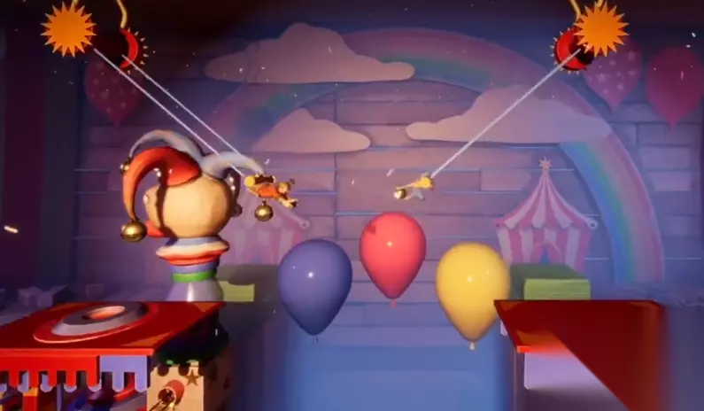 这里需要注意要两个人保持同频,一起往中间摇,等到差不多了再扔小球,不然容易扔空。对面的人拿到小球后瞬时扔进右侧的机器里面,小球从机器里面落了出来,把小球拿上往前跳,跳过几个气球来到新的平台。最后把小球放入弹弓之中,两个人一起操作,合力将小球发射到天空中小丑气球的脑袋上。把小丑气球打爆,成功过关绝世表演的全部内容,通往下一关的桥梁落了下来。
