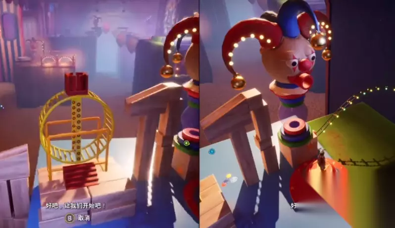 前方的落脚点升起来,通关过落脚点来到下一处平台。还是先踩按钮让小丑吐出小球,小球向前滚放在木条上,需要通过一根钢丝来到对面。此时需要一个人在钢丝上踩独轮,另外一个人在站下面人的肩膀上面,控制好平衡,让小球保持在木条上面不要掉下去。如果稍有不慎让小球偏移了木条掉了下去,需要重新回到钢丝最前端重新开始踩钢丝。来到对面平台后,上面保持平衡的人把木条往右移,让球进入到轨道之中。随后踩按钮让小球出来,一个人在这边的绳索上倒挂金钩,另外一个人去对面的绳索倒挂金钩。通过摇摆将小球抛掷空中,对面的人摇摆接到小球。