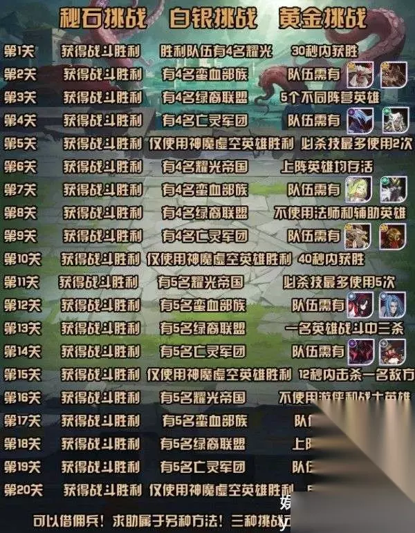 英雄品质单紫即用 可以无限挑战秘石 白银 黄金可以分开完成即一场战斗完成一个挑战即可,求助是让大佬帮你过关 仅限秘石 三种挑战是可以使用佣兵的,因为怪物难度开副本即固定,可以囤着倒数几天进行挑战 以上就是剑与远征秘宝峡湾过关条件有哪些的全部内容,希望大家喜欢。