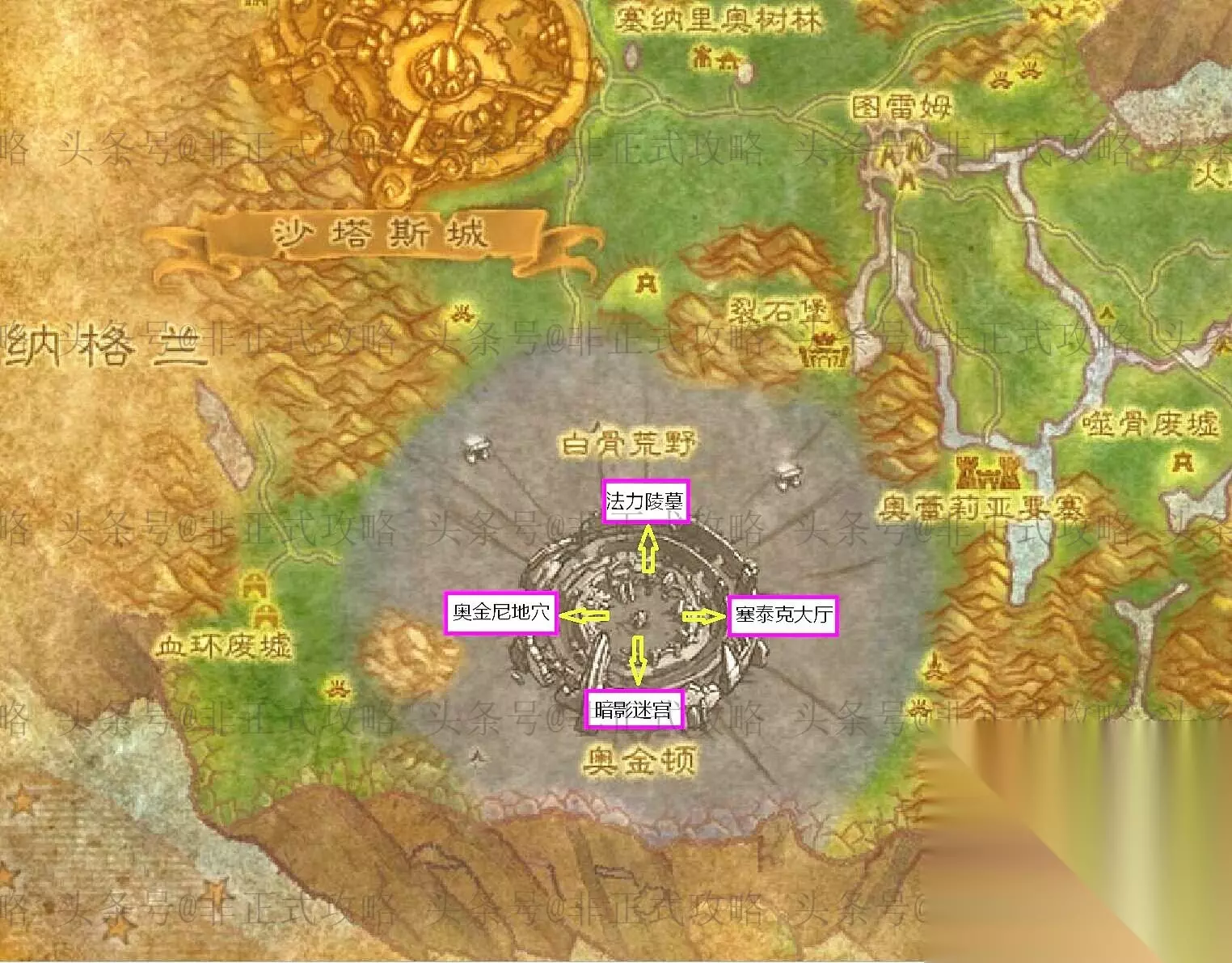 如今的奥金顿,只留下残垣断壁,周围一片焦土,像是一道残留在美丽的泰罗卡森林的疤痕,诉说着曾经的历史...... 副本位置: 奥金顿也是一个副本群,由4个五人副本组成,它们的英雄本钥匙都是找贫民窟军需官纳克杜(沙塔斯62.0,68.8)购买。 在没有飞行坐骑的时候,可以通过奥金顿外围的通道入口下到仪式广场(如图一所示),从而前往想要去的副本。这四个副本的分布基本是对角线的位置,以时钟数字排列来看,分别是12点、9点、3点、6点(图二)。 【法力陵墓】,64~66级,对应声望:星界财团。军需官卡拉兹位置:虚空风暴的风暴尖塔(43.6,34.3)。 【奥金尼地穴】,65~67级,对应声望:贫民窟。军需官纳克杜的位置:沙塔斯城的贫民窟(位于占星银行的大后方)。 【塞泰克大厅】,67~69级,对应声望:贫民窟。 【暗影迷宫】,70级,对应声望:贫民窟。进出副本外面的大门需要钥匙(就在副本【塞泰克大厅】尾王boss身后的箱子里)。