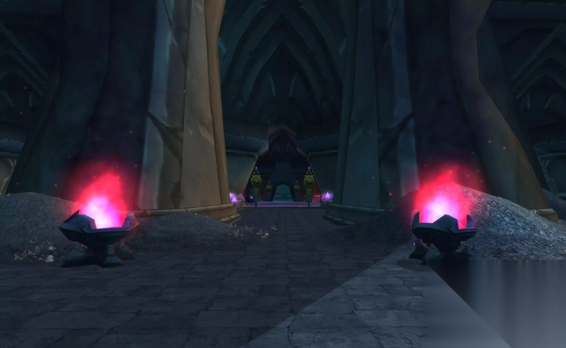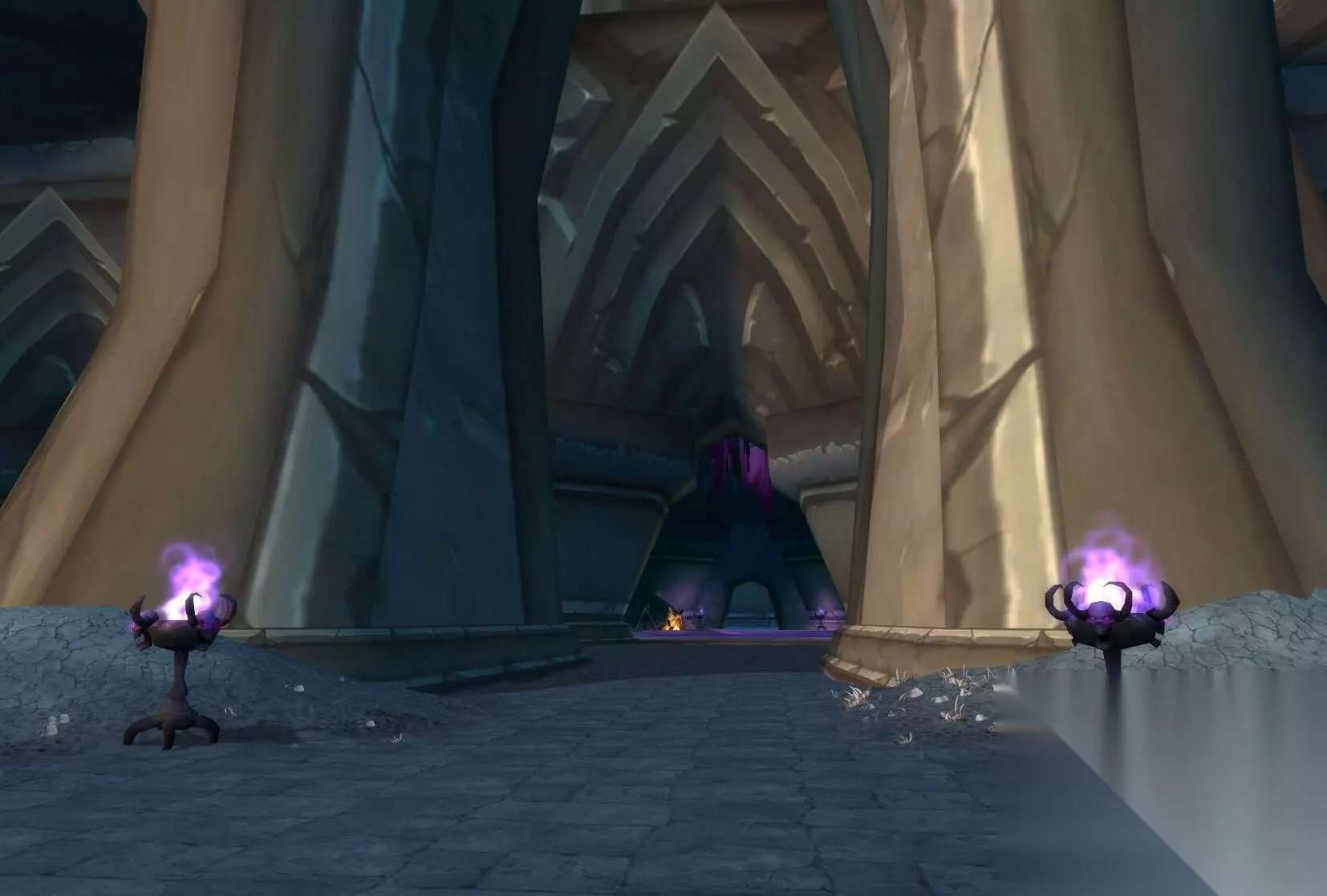 法力陵墓的入口 ①、【66地下城】安全第一: ▶ 进入法力陵墓杀够5个虚灵缚法者、5个虚灵巫师、5个节点潜行者和10个虚灵盗墓者,最后激活沙法尔房间的前一个房间的虚灵传送器。 ②、【66地下城】扫除竞争者: ▶ 进入法力陵墓杀死最后boss节点亲王沙法尔,并带回他的裹布。 ③、【66地下城】别人的烂摊子: ▶ 这个任务是完成【60地下城】安全第一的杀怪任务之后,激活沙法尔房间的前一个房间的虚灵传送器,交任务并同时接到的后续,是护送一名工程师安全到达副本入口的保镖任务,建议完成前面两个任务后再做。 ●【奥金尼地穴】 副本门口两个火堆的颜色和造型如下图所示。 往里面直行,在副本门口找奥德里姆斯宗父接到【67地下城】一切都会变好的,而旁边的哈雷小朋友给予的则是一个跑图+杀精英的系列任务。