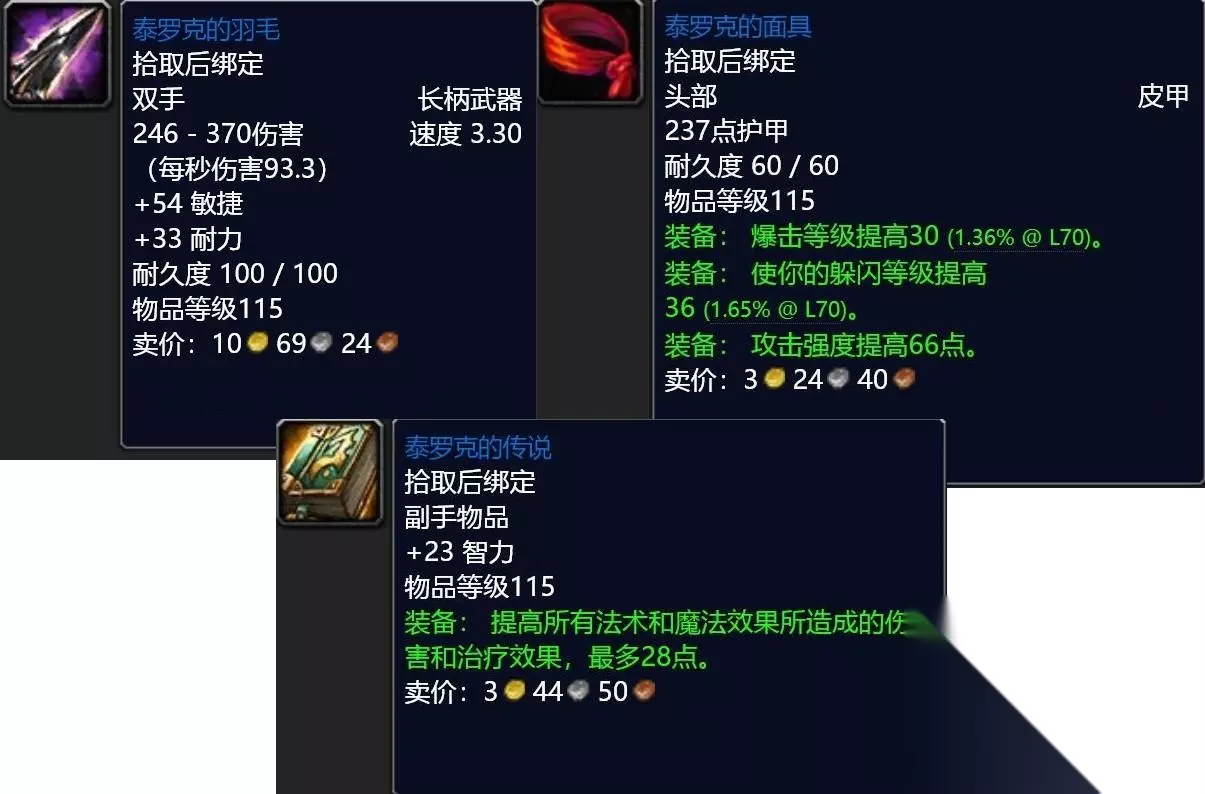 ②、【69地下城】泰罗克的传说(任务奖励丰厚): ▶ 进入副本,找到泰罗克的面具(1号boss掉落)、泰罗克的羽毛(尾王掉落)和泰罗克的传说(在召唤乌鸦安苏的地上有一本书籍)。完成此任务奖励以下三件物品,对于刚到70级的玩家值得一用。