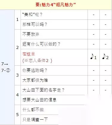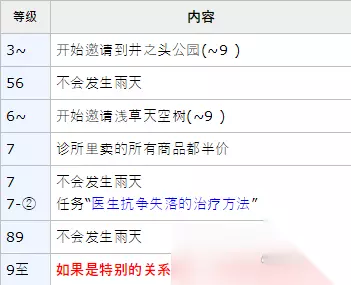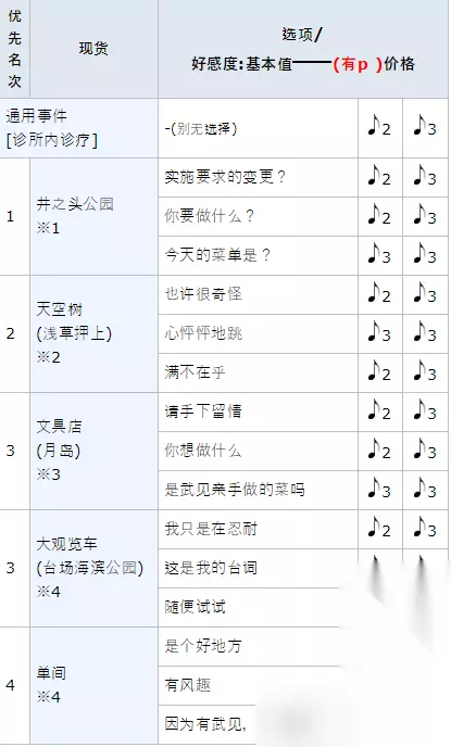 ※1 :除雨天外,限定等级3~9之间※ ※2 :除雨天外,限定等级6~9之间※(提前发生井之头公园活动) ※3 :保持朋友关系时发生( 9级以上) ※4 :特殊关系时发生( 9级以上)