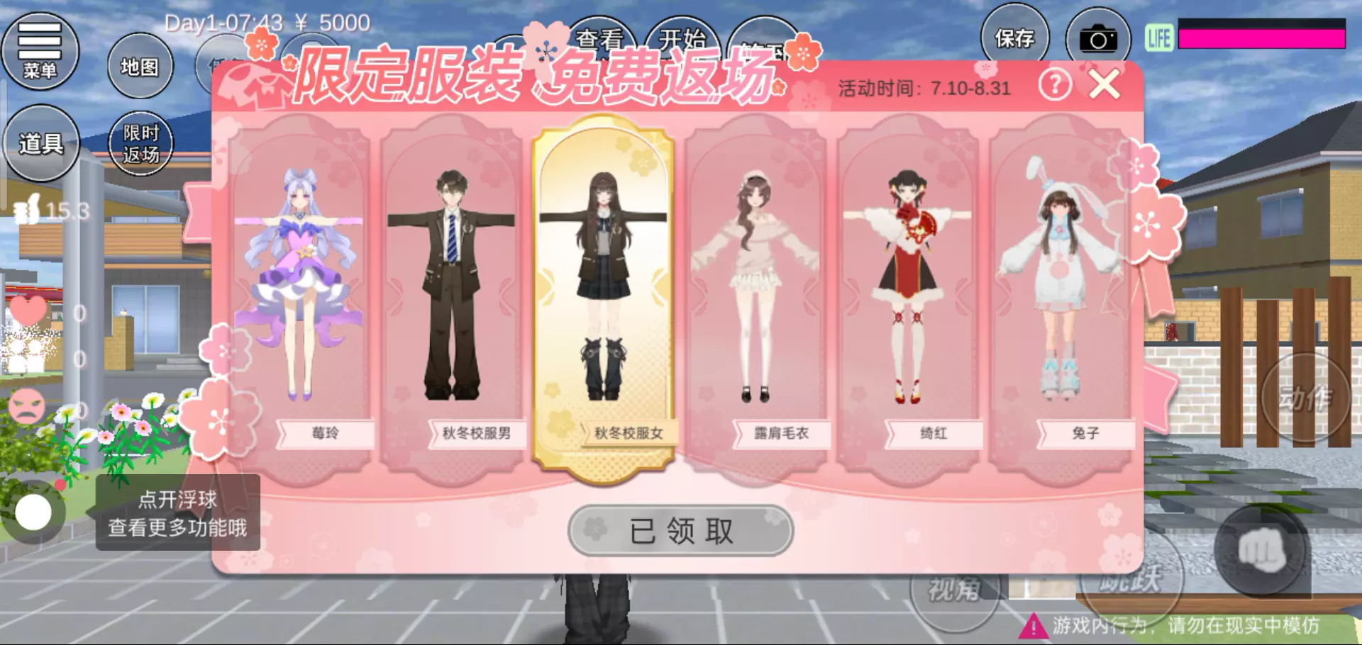 太好了,还免费领取衣服 甚至还加了签到功能 但是解锁衣服要看广告 要是不看广告就好了