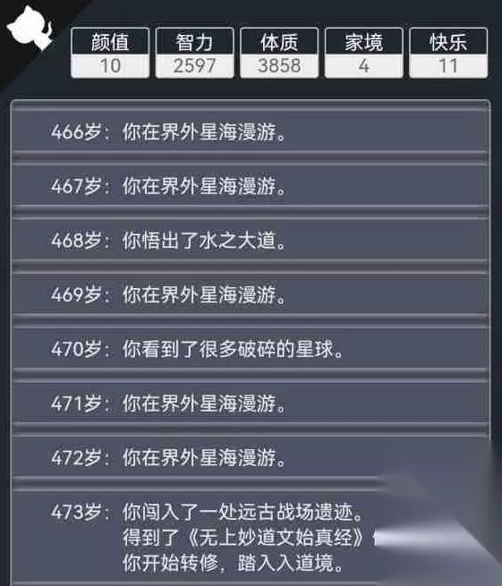 古法需要智力10以上,必须点加智天赋,或者看脸刷随机事件,即使悟出混沌大道才能去界外,全靠运气,即使悟出来了,也很难找到别的修行法,经常蹉跎百年到寿元耗尽,正常情况下很难出 当世法可以靠悟出天道稳定成仙,触发条件为微观领域突破、诺贝尔物理学奖,极大提高属性,可稳定达到渡劫需要,且可以不满足五行+本源大道,也可以度过天劫