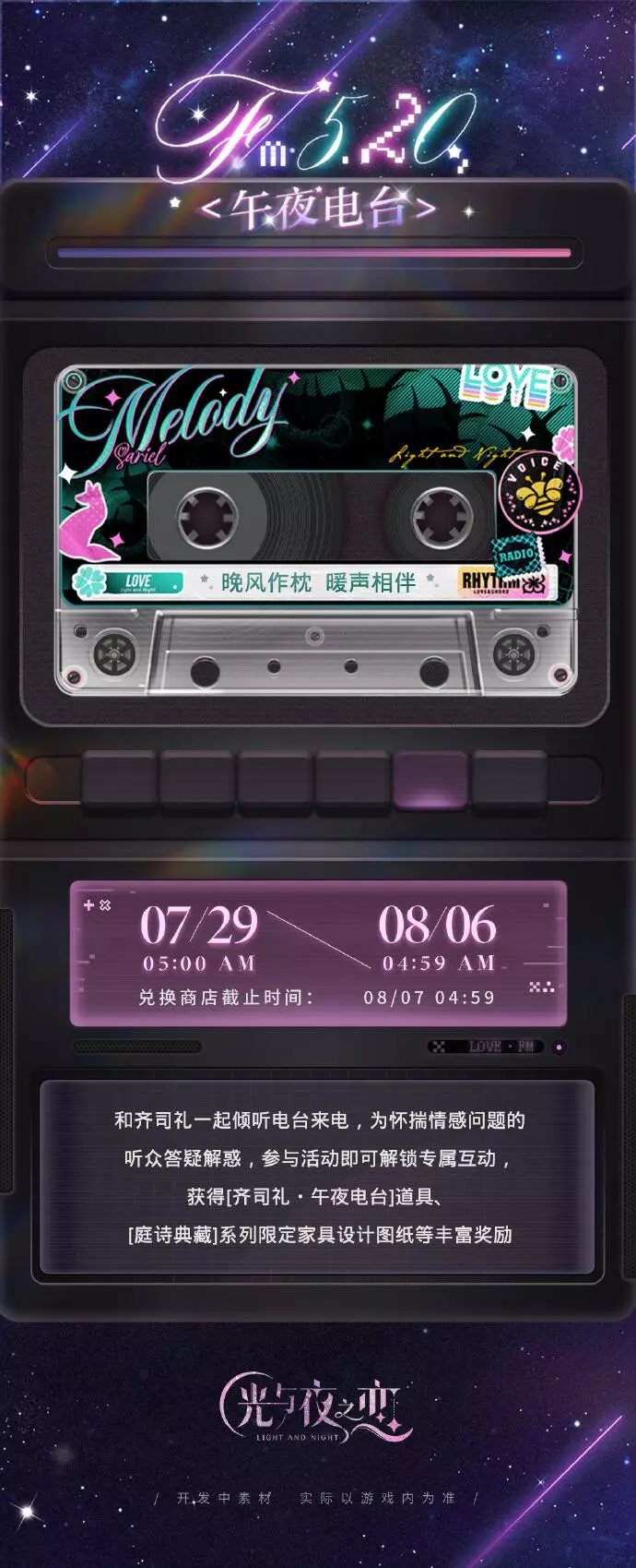 ② 道具[谧夜留声・垂曜]可通过完成[暖场音速]小游戏、完成[调频计划]指定任务收集,获得后可在商店兑换活动限时许愿道具[幻语花笺・垂曜]、[庭诗典藏]系列限定家具设计图纸等丰富奖励,拥有设计图纸后即可在工作室中消耗制作材料获取对应家具。