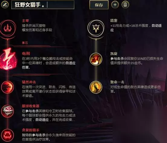 讲一下豹女大概的想法:在没了老版符文后选择了主宰系.少了攻击速度.没了冷缩护甲等等 攻击速度可以通过猎人的宽刃来弥补可以看到新版本的野刀是有对应的攻击速度加成的