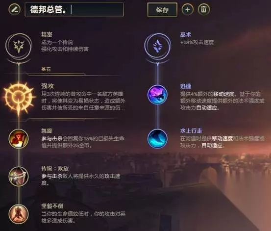 因为英雄的特殊性.选择了攻速类别的精密系来增加刷野速度.选择强攻对于前中期的加成明显 副系选择巫术所增加的移动速度对赵信前期的统治力也是有一定的加成。 另外一套是这样: