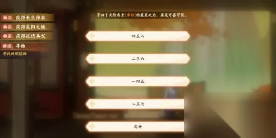 孟章神君-长生神木 陵光神君-阳炎之烛 执明神君-明灵水晶 监兵神君-征伐兵戈 把紫薇棋谱交给李淳风-完 和鸣之琴解谜攻略 ①探查香炉,在幻境,在钓鱼的猫猫正下方,有一个看起来像炉盖的东西,探查完毕会获得鹿角霜。 ②穿梭进入忘川,打开桌上第一个盒子,密码五四五一三,获得悲之果。在盒子前方有一个泛红光的灯笼,拿到角音灯笼。 ③喂给鸟悲之果,它会唱第一.首歌。然后将角音灯笼挂在中间。在鸟旁边有一个泛红的,是宫音灯笼,把它挂在最下面。竹林里有第三个灯笼,羽音灯笼,挂在最上面。 ④顺序:从左到右: 12345,5-1-2-4-2-1。在最左边灯笼处获得竹刀,中间泛红的罐子用来加鹿角霜,得到琴漆。进入幻境,把琴漆交给嵇康,他会让你去找琴徽。 ⑤在钓鱼的猫猫下面石头上的黑色盒子里获得琴徽,密码二三七。砍旁边的竹林,砍两下,获得锯子。把琴徽交给嵇康。 ⑥进入忘川,打开桌上的第二个盒子,一三二三五,获得喜之果。把喜之果喂给鸟,会唱第二首,顺序: 1-3-5-4-3-4-3-1获得商音和徵音琴弦,进入幻境,在嵇康面前的石块上获得琴弦,在拱桥左边的柱子那获得琴弦,在竹林获得最后一个琴弦。 ⑦进入忘川,在桌子右边加工,获得岳山,进入幻境,把它们交给嵇康,建议多点几下。 ⑧拼接。 忘川风华录寻喵记攻略 进入途径:主界面-风华录-解谜