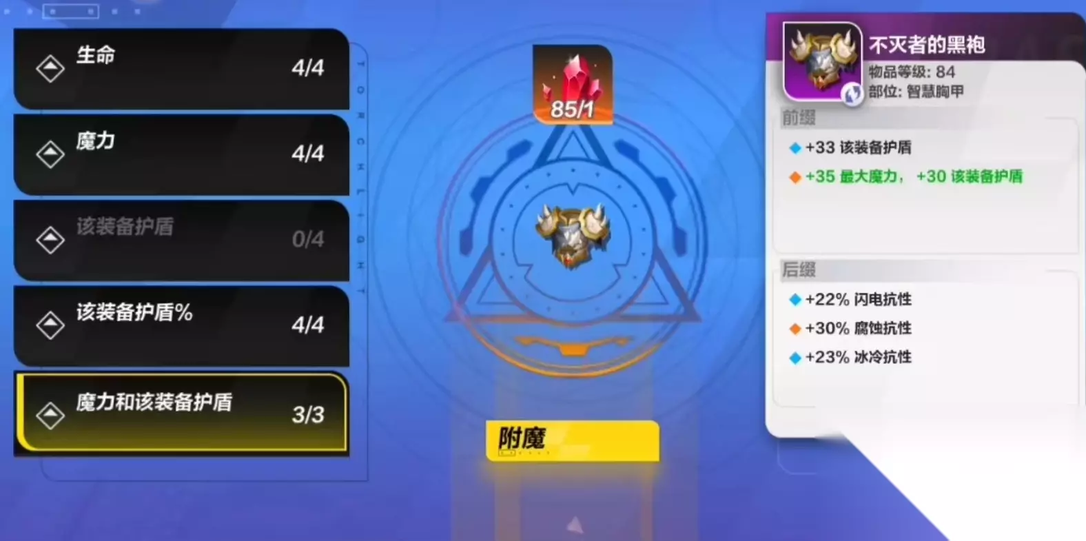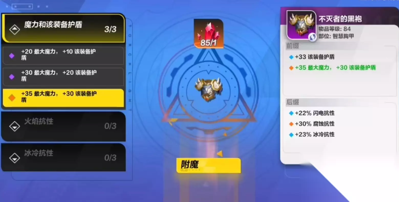 3、附魔需要消耗一定的材料,不同的装备在附魔不同的词条时所需要的材料种类也不一样的。 4、用一件装备词条是不能重复出现的,比如已经有增加力量的词条,那么就不能继续附魔力量了。