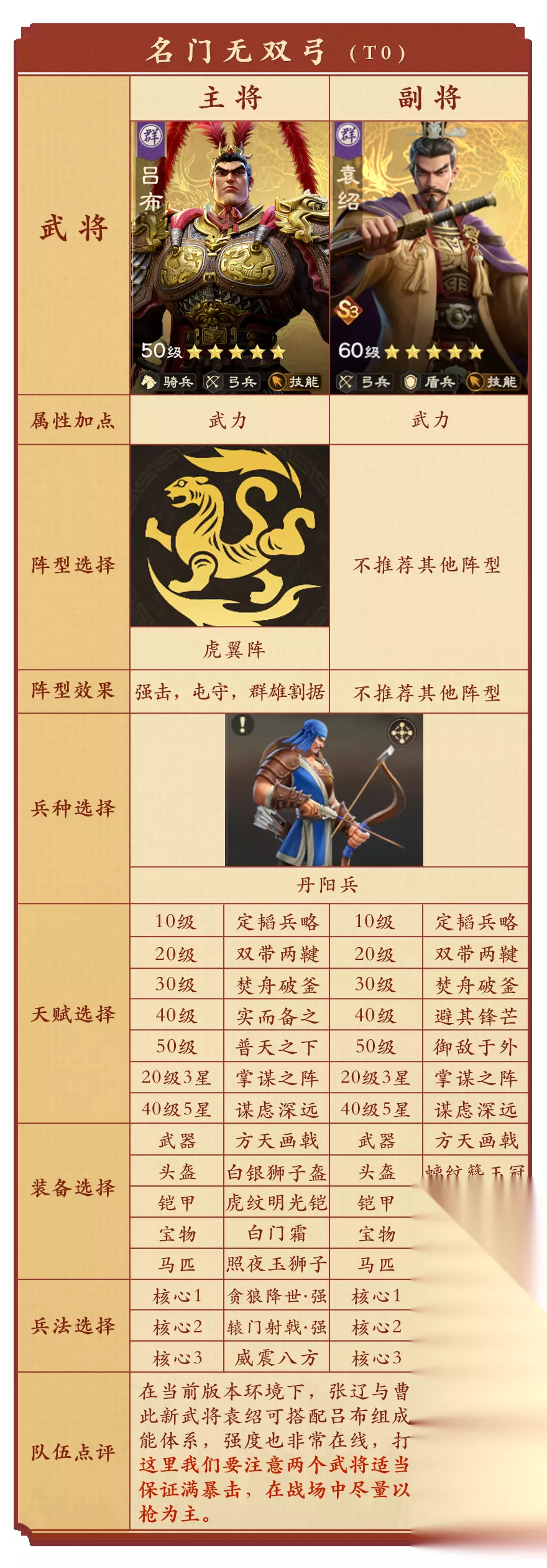 第二队:名门无双弓 吕布搭配新搭档袁绍,爆发能力非常惊人,回归S1的强势版本。该队伍可作为反集结队伍使用,野战表现也非常出色。团战中能有效针对枪兵体系。