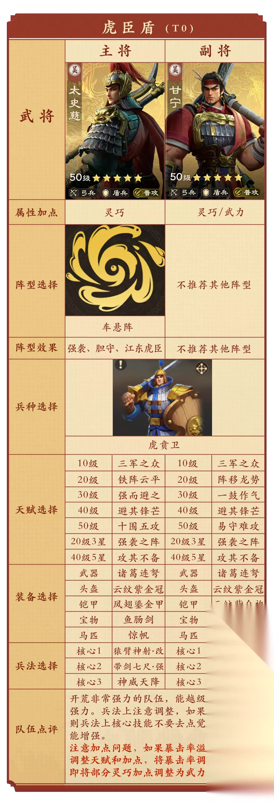 第四队:虎臣盾 太史慈和甘宁,相较以往的生存盾,输出更高,集火能力更强,且能有效应对各种本赛季各种强势的弓兵体系(如陆逊异常弓和名门无双弓),且作为驻守和进攻车头都不错。