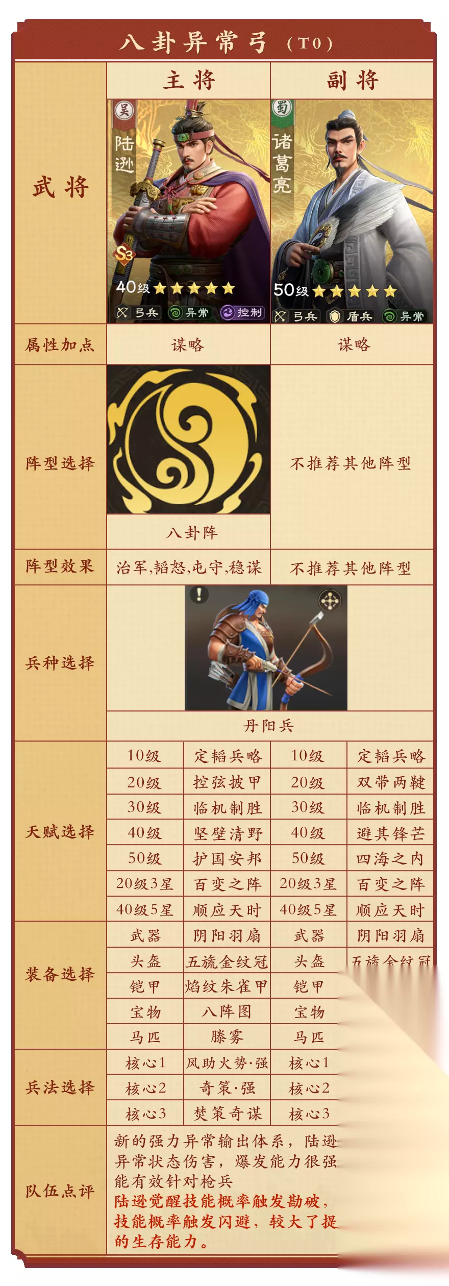 第一队:八卦异常弓 诸葛亮陆逊组成的八卦阵异常弓,陆逊独特的机制能够引爆异常状态的所有伤害,大大提升了异常队伍的爆发能力,能够在本赛季占据一席之地。 陆逊觉醒技能概率触发勘破,诸葛亮觉醒技能概率触发闪避,较大了提高了异常队的生存能力。