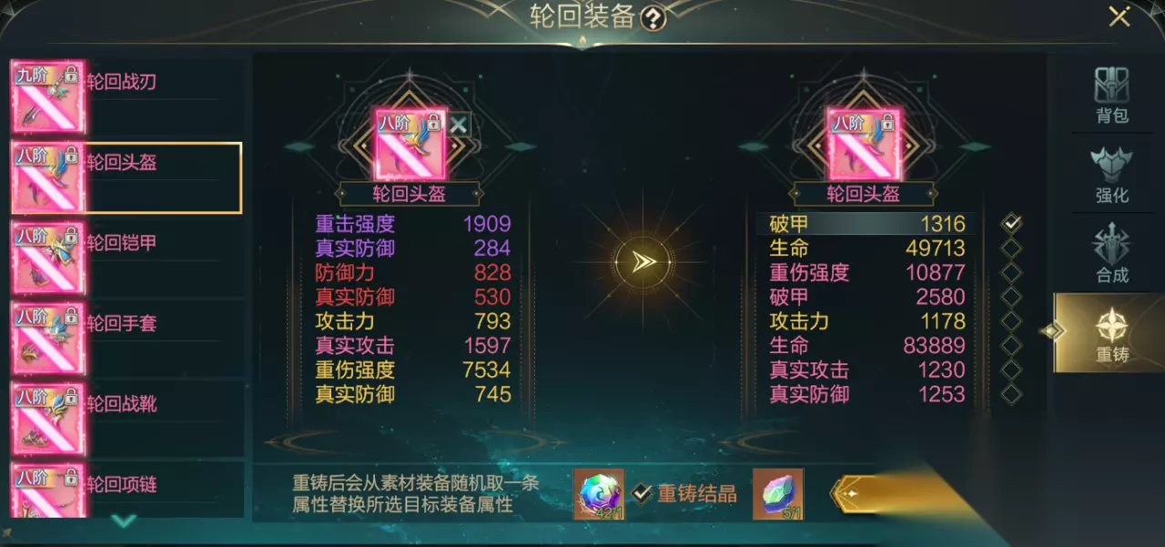 · 核心材料:「轮回结晶」通过分解多余装备获得,合成消耗随阶级提升 · 必做要点:合成必定新增一条重铸属性(重点!),建议优先合成武器 / 戒指等核心部位,从 1 阶开始逐步往上,分解废装囤结晶 2. 重铸系统:词条转移全攻略