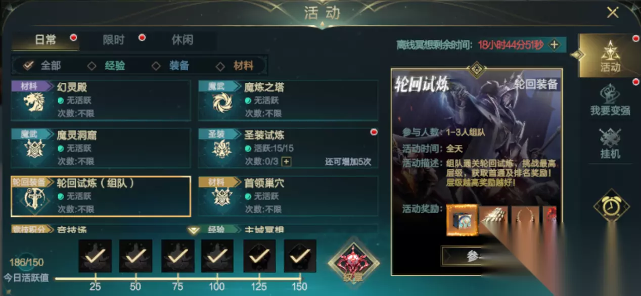 1. 装备获取 · 每周必做:每周首次通关各层试炼按星级领「轮回装备宝箱」(使用后可随机获得一件1阶轮回装备),每周一刷新进度,记得组固定队拿满奖励 · 装备定位:独立于普通装备的套装体系,强化 / 合成 / 重铸后能提供巨额属性,后期 PVP 必备 2. 强化系统:保底道具别乱用