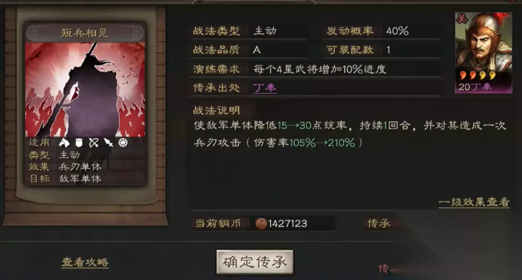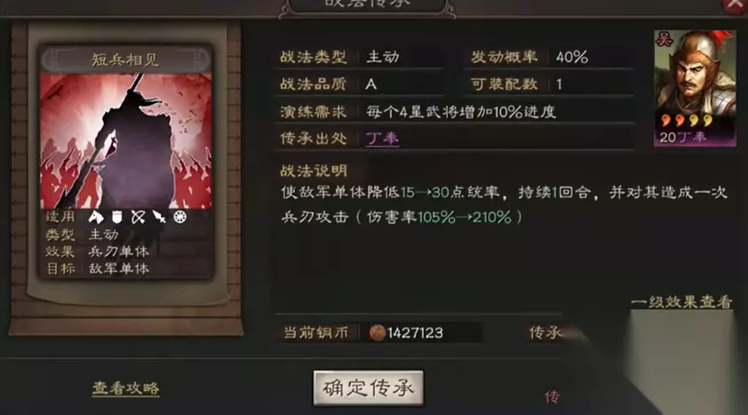 除了自身战斗力过硬,丁奉的战略价值还延伸到了战法传承层面,这深化了他作为神卡的内涵。其自带战法短兵相见可以被传承,变为一个A级战法供其他武将学习。这个传承战法完美保留了其核心机制,对于许多缺乏优秀单体破防技能的五星物理输出武将而言,是一个极佳的补充。