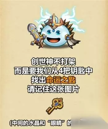 创世神不打架,而是要我们从4把钥匙中,找出命运之匙,请记住如下的图片 (命运之匙:中间的水晶和“眼睛”的形状很像)