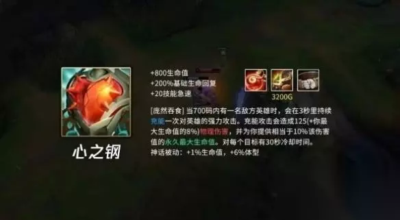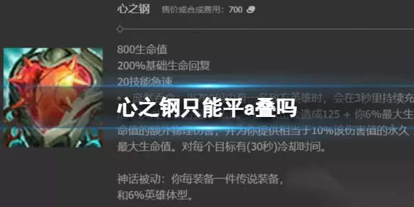 心之钢只能平a叠吗 答:只能平a叠 心之钢叠层数介绍: 1、当700码内有一名敌方英雄时,心之钢会在3秒里持续充能一次可以对英雄进行充能攻击; 2、充能攻击会造成125+6%最大生命值的额外物理伤害,并给英雄提供相当于10%该伤害值的永久最大生命值,每个目标都有30秒的冷却时间;