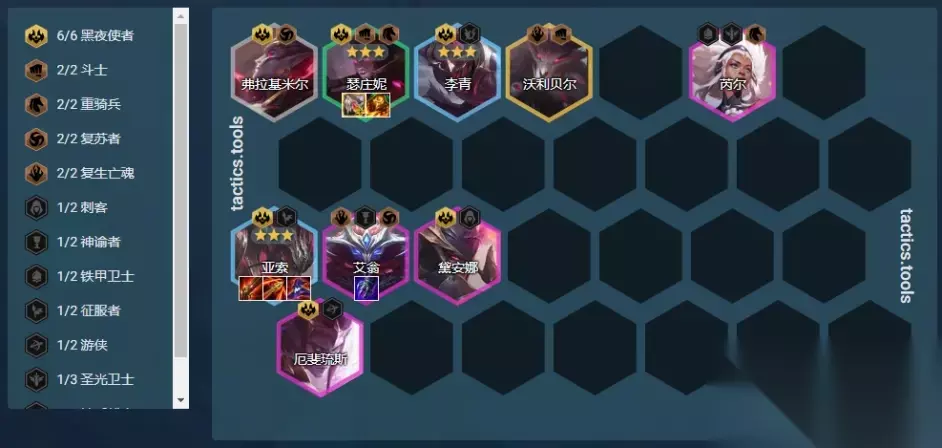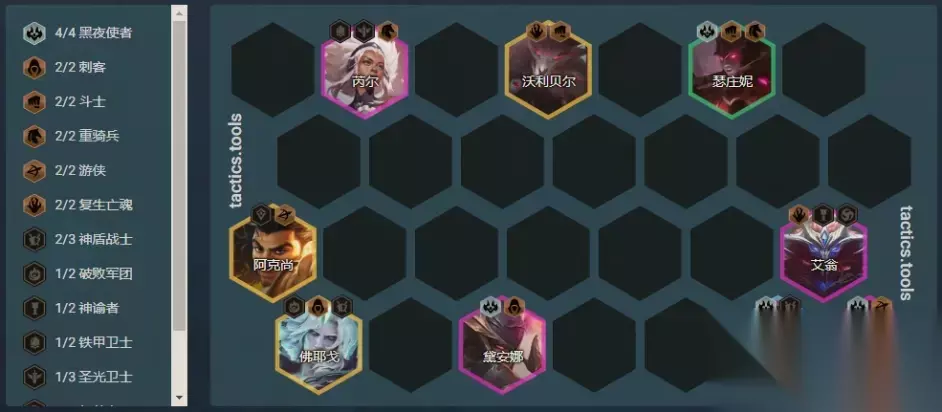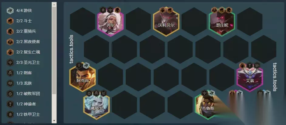过渡方式:速升7级或8级; 开局散件:坦克型、法师型装备; 阵容链接:黑夜游侠; 核心单位:厄斐琉斯; 装备推荐: 厄斐琉斯:羊刀、杀人剑/无尽、饮血剑/光明正义/正义; 阿克尚:任意输出装; 芮尔、猪妹:任意肉装; 游侠与羊刀:在2游侠体系中,羊刀是厄斐琉斯必备的。如果阵容成型却没有羊刀,可以拆4黑夜为2黑夜,然后上4游侠; S-级阵容:丧尸九五(很难成型,大成为S+)