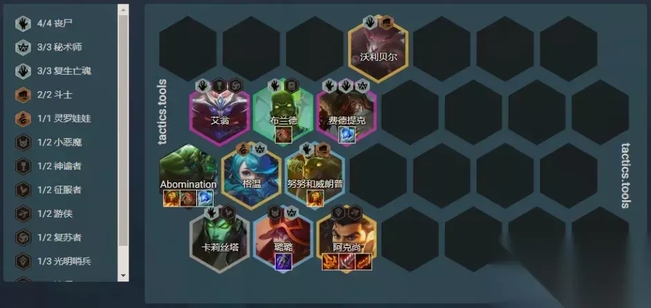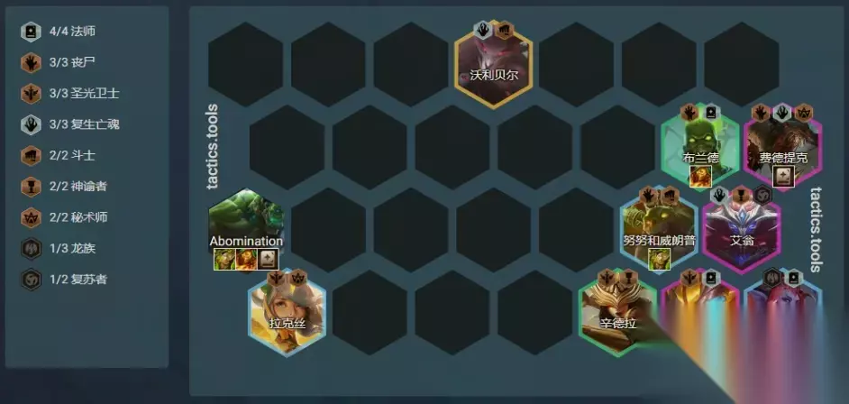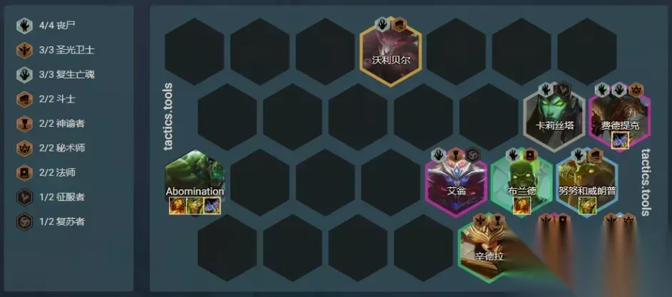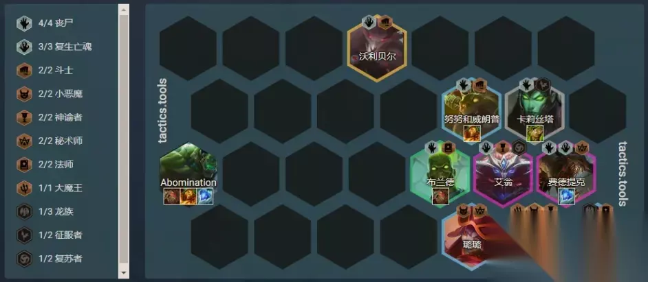 过渡方式:速升7级或8级; 开局散件:坦克型、法师型装备; 阵容链接:丧尸复生大眼; 核心单位:大眼; 装备推荐: 大眼:青龙刀、法强装、法强装或吸血装; 丧尸:狂徒、日炎、反甲、冰心、救赎、泰坦的坚决等肉装; S级阵容:升级版 - 丧尸四法