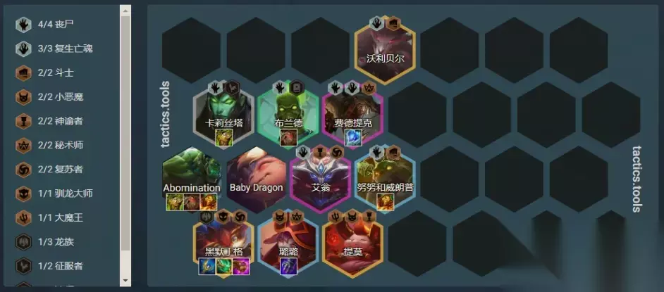过渡方式:3丧尸/3龙开局 → 速八级; 开局散件:坦克型、法师型(大发明家)、攻击型装备(阿克尚); 阵容链接:丧尸大头、丧尸阿克尚; 核心单位:大发明家/阿克尚二选一(阿克尚有羊刀可以不开游侠); 装备推荐: 丧尸:狂徒、日炎、反甲、龙牙、冰心、救赎、泰坦的坚决等肉装; 大发明家:青龙刀、大天使、羊刀; 阿克尚:饮血、杀人剑、飓风、羊刀、无尽、泰坦; 游戏后期:若需要拆丧尸拿装备,可以拆至3丧尸,或放弃丧尸。9级:3复生3丧尸+提莫+璐璐+C位; 丧尸系列阵容总结 丧尸系列阵容可以划分出以上大致的五个分支:丧尸婕拉、圣光复生大眼、丧尸四法、丧尸大发明家、丧尸阿克尚; 只要游戏没有进入大后期、你的阵容没有完全成型,就有摇摆的可能性。丧尸和龙族羁绊在11.15的热补丁中经历了一轮削弱,但这并不英雄这个阵容的强度,独特的经济型羁绊、简单可靠的前排以及后期可以造成成吨伤害的后排核心,使得这个阵容无论是在国服、外服,都是出场率的第一阶梯。下版本丧尸的阶段成长属性将从20%再次削弱到16%,强度会再次下降,大家在下周四(8月12日)更新前快多玩几盘吧! S-级阵容:控制流六哨兵