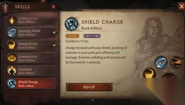 技能介绍: 主手技能:神圣之火(Sacred Fire):角色到达34级时解锁该技能。 回旋盾(Spinning Shield):角色在1级时解锁该技能。 回旋盾 战马拖行(Draw and Quarter):角色到达15级时解锁该技能。 战马拖行 奉献(Consecration):角色到达20级时解锁该技能。 奉献 光之咒(Conjuration of Light):角色达到50级时解锁该技能。 神圣之火 惩罚 神圣之火是笔者建议圣教军玩家必备的主手技能。即使这项技能的解锁等级要求要比圣教军的初始技能:惩罚(Punish)要高得多,但是由于其优秀的群体伤害能力,玩家的等待还是值得的。在释放这个技能后,圣教军角色配备的武器将附带火焰效果,对周围所有敌人造成25%的伤害。这个技能的攻击效果看似简单,然而考虑到额外叠加的25%的群体伤害,神圣之火可以让玩家在地狱难度下一击消灭掉一群敌人。 回旋盾 回旋盾是圣教军早期就可以解锁的一项技能,尤其在攻击成群的怪物时有奇效。释放该技能后,圣教军会投掷出一个旋转的盾牌,对其抛出路径上的所有敌人造成伤害。这个技能的特别之处在于盾牌会在掷出之后返回到角色手中,因此可以对沿途的敌人造成二次打击。回旋盾的技能会受到角色装备的一些传奇装备的影响,从而变得更加强力。比如说令掷出的盾牌在敌人之间反弹,对怪物造成多重伤害。 圣教军技能界面 战马拖行 圣教军作为骑士的一个头衔,骑马带头冲锋才是正道,而战马拖行就为玩家提供了这样一个机会。在释放该技能后,角色会召唤一匹战马,技能效果持续5秒时间,而在此期间角色的移动速度会得到显著提升,同时也赋予圣教军角色居高临下攻击敌人的能力。当角色跨坐在战马之上时,会出现一条链子,用以捆绑住附近的敌人,并把它们拖到战马的后面。 奉献 奉献虽说是一个20级的技能,但它的威力却超出了这个技能的等级要求。在圣教军角色释放奉献后会在地上产生一个符文,这个符文对其周围的敌人在6秒内会持续输出AOE伤害。这个技能可以对恶魔类敌人造成巨大的伤害。如果圣教军玩家喜欢在敌人群里无双乱斗,这个技能可以说是必不可少的。