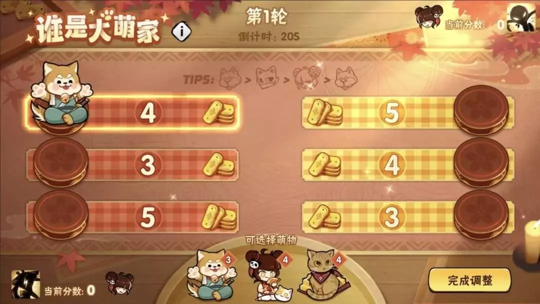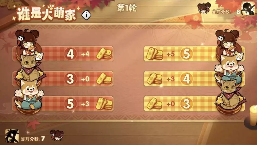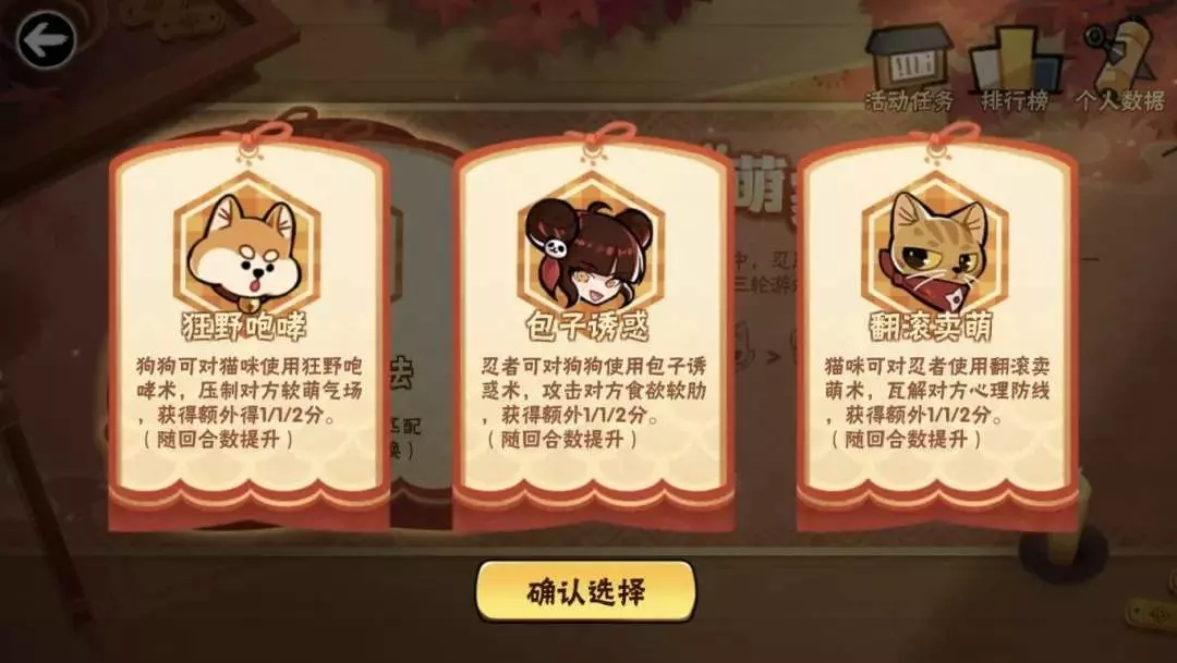 对局过程中,将按照对局前选择的战法效果以及萌物之间的克制关系进行分数结算,萌物克制关系为:狗狗>猫咪>忍者>狗狗。