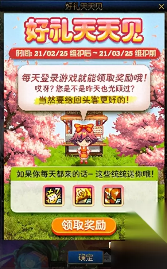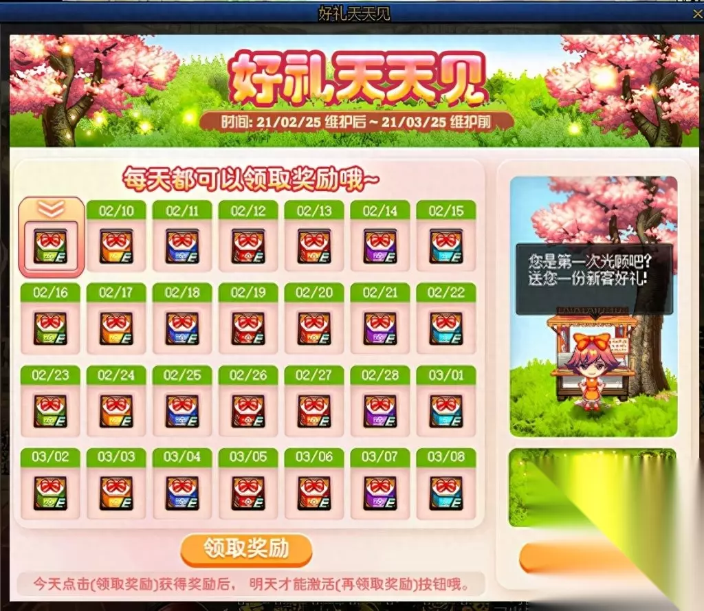好礼天天见,直白的说就是签到送礼,翻花样的来。 我们都知道,过了春节一定是到了春天了,而为了迎接新春,要有新的气象,所以我们在游戏当中也要感受新春带来的气息。