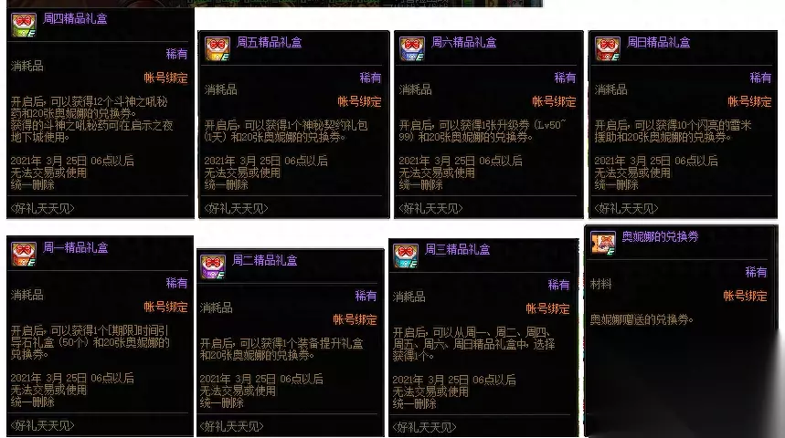 签到当然是为了获得大量的道具奖励,签到奖励总共分为两种形式,玩家们每日签到会领取一份奖励,然后每一周7天为一个循环,也就是说周一至周7有不同的奖励,而到周7后会从周1重新开始,总共签到4周。当然,还有再次领取的奖励! 每日的签到奖励: 周一:时间引导是20个,20张奥尼娜的兑换券 周二:1个装备提升礼盒,20张奥尼娜的兑换券 周三:可以从周一~周日的精品礼盒中选择一个获得 周四:12个斗神之吼秘药,20张奥尼娜的兑换券 周五:1天神秘契约,20张奥尼娜的兑换券 周六:1张升级券(50级~99级),20张奥尼娜的兑换券 周日:10个闪亮的雷米援助,20张奥尼娜的兑换券 再次领取的奖励:奥尼娜的兑换券 以上就是每日对应的星期1~星期天的签到奖励了。