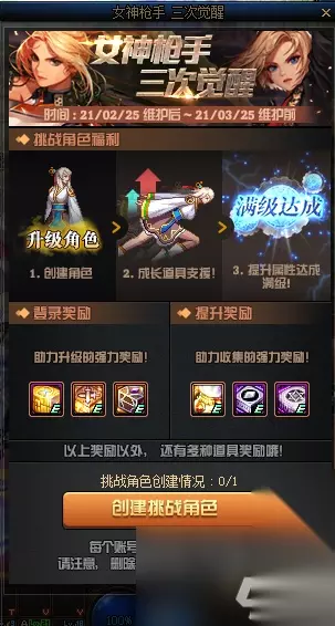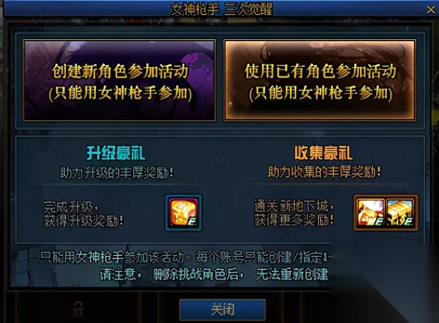 本活动也说得非常清楚,每一个账号只能预约一个角色,然后完成挑战获得奖励。 该活动毕竟是随着三觉职业而来的,且女枪三觉是比较晚的,所以奖励也是越来越丰厚。女枪三觉预约的奖励明显要比以往更加丰富。 奖励分为两种,一个是重新创建一个角色,另外一个是选择已有的角色参加该活动,所以整体的奖励有一点点不同。