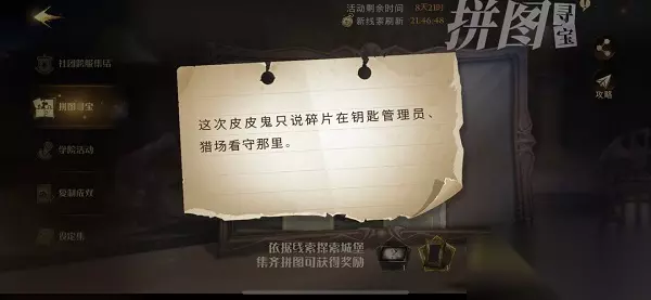 《哈利波特魔法觉醒》这次皮皮鬼只说碎片在钥匙管理员猎场看守那里位置介绍 1、拼图信息:“这次皮皮鬼只说碎片在钥匙管理员、猎场看守那里。”