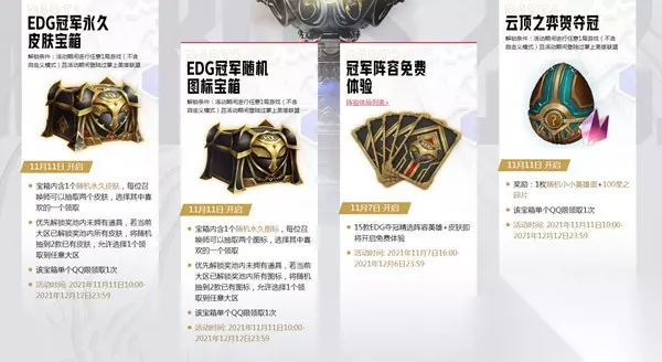 LOL英雄联盟EDG夺冠庆典活动奖励获取方法 再次恭喜EDG勇夺2021全球总决赛冠军!目前召唤师峡谷地图EDG冠军战队图标纪念塔和精选夺冠阵容英雄皮肤免费体验已经开启,欢迎广大召唤师进入游戏胜地巡礼。 为响应广大召唤师和LPL战队粉丝的热情,部分夺冠庆典活动将提前开启。以下活动开启时间变更为2021年11月11日10:00,结束时间不变。 活动地址:点此前往参与活动 活动1: EDG冠军永久皮肤宝箱 活动2: EDG冠军永久图标宝箱 活动3: 云顶之弈贺夺冠