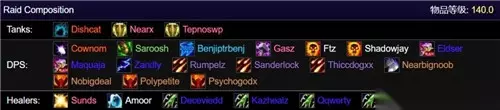 坦克组:2熊+1防骑 治疗组:1奶德+1奶骑+1戒律牧+3奶萨 法系组:1奥法+3毁灭术+1邪咒术+2暗牧 物理组:1惩戒骑+1武器战+1盗贼+2增强萨+3兽王猎+1生存猎 我们可以看到这是一个偏远程的团队,也是OS公会一向以来的风格,他们在PTR重开之后的第一天依靠这个阵容打通了全程。在鸡蛋的战斗中,兽王猎打出了非常高的伤害,第一名的秒伤高达2600+。 另外还有两个外服公会也是一套阵容打通,我们也来看一下他们的阵容是如何的。首先是Fusion: