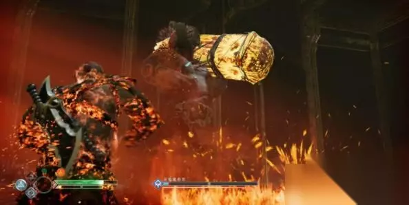 我们接着去石球的背面,用链刃把墙上的树枝烧掉,然后带着上一个标志的能量爬上去,传递给上面的石球。