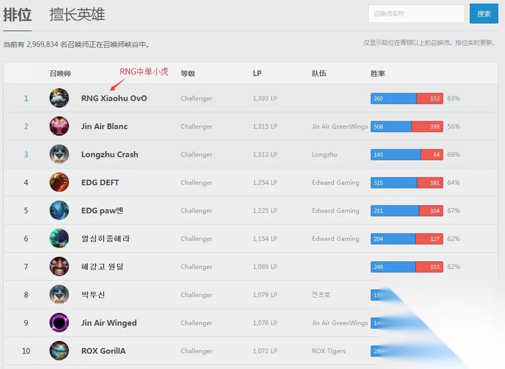 2、点击上方的排位,大家就可以看到最新的韩服排位排名了,目前我们的RNG小虎在韩服第一哦!