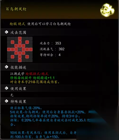 逸剑风云决游戏中有各种各样的武器装备,百鸟朝凤枪也是其中之一,百鸟朝凤枪在完成甘泉村系列任务之后就能获取到,接下来一起来了解一下吧。 逸剑风云决百鸟朝凤枪怎么获取 答:完成甘泉村系列任务之后就能获取到 1、玩家需要再甘泉村触发剧情,之后需要与欧阳海以及裴庆这两个npc对话。 2、然后前往神鹰门这里触发剧情,之后会遇到冷鹰,触发剧情与门主战斗。 3、完成战斗可以获得血河神鉴,任务剧情结束以后可以获得鬼影幽冥大法、凝血神爪。 ps:同时冷鹰也会入队,并且提升好感度。 4、最后前往平阳堡就可以触发后续的剧情,完成以后即可获得百鸟朝凤枪。 百鸟朝凤枪介绍: 攻击力353,消耗真气392,等待回合4 在提升一个等级之后是可以提升上对应的枪棍精通+1.1,同时对自身米字21格范围造成伤害。 特殊效果 5级效果-白鸟朝凤:自身暴击抵抗+20%,为自身添加1~2层,持续3回合。 招架:有20%几率受到攻击之后就可以时减免35点伤害,持续3回台。 10级效果-有凤来仪:能对受到的伤害-100点伤害,自身气血+150。