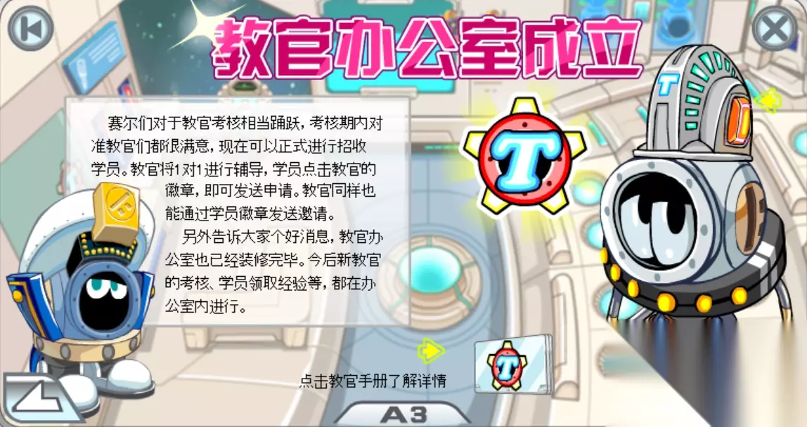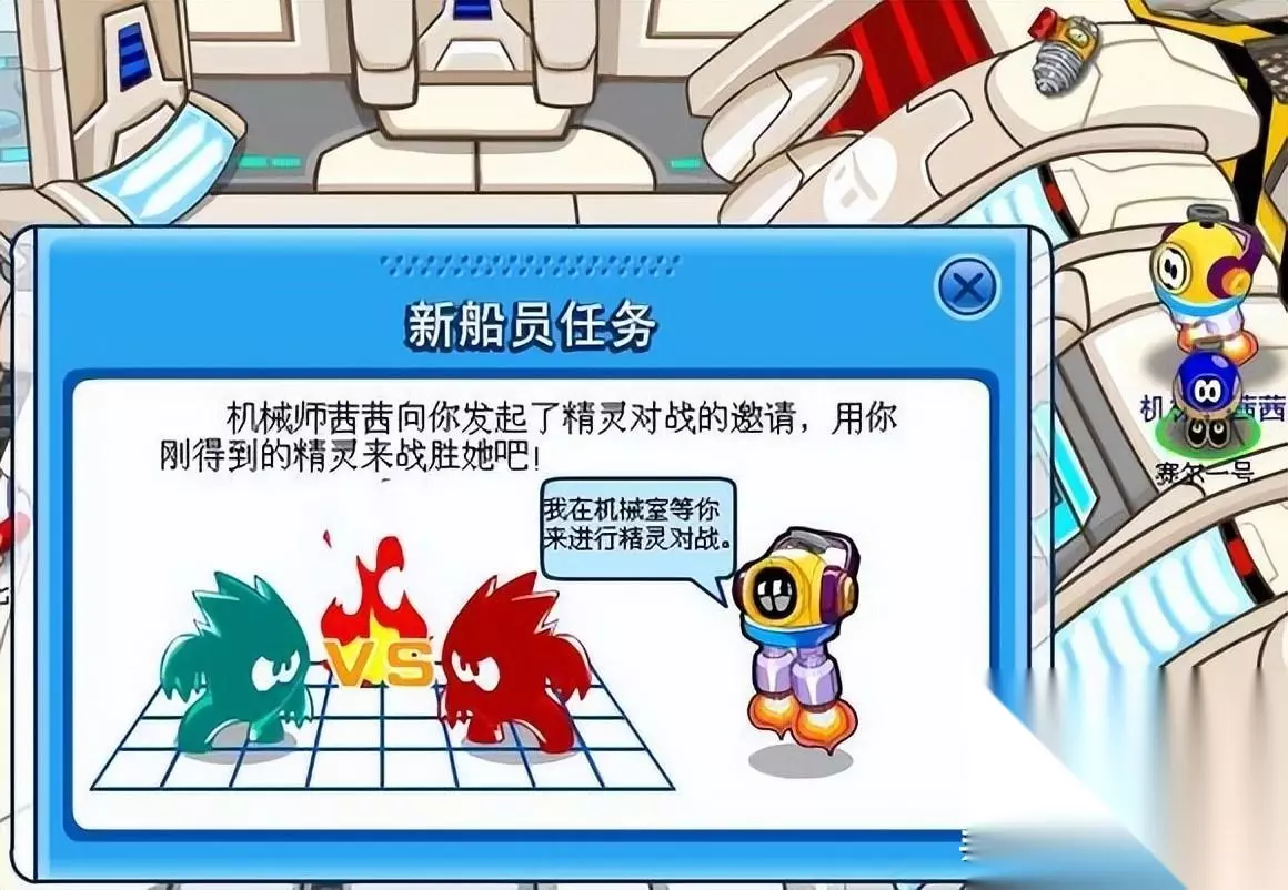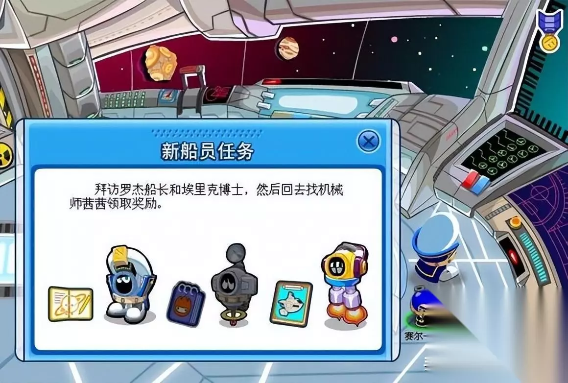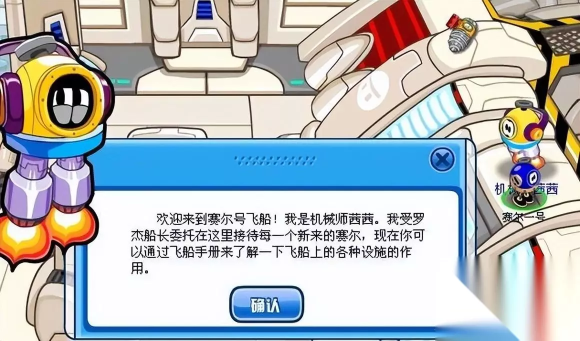 屏幕左下角有一个“雷达显示屏”,这其实就是地图,点击打开,可以直接到达宇宙世界的五个星球和赛尔号飞船的各个舱室。来到“船长室”,点击船长,他指示你去查看《飞船手册》,看完知道了赛尔号的由来。