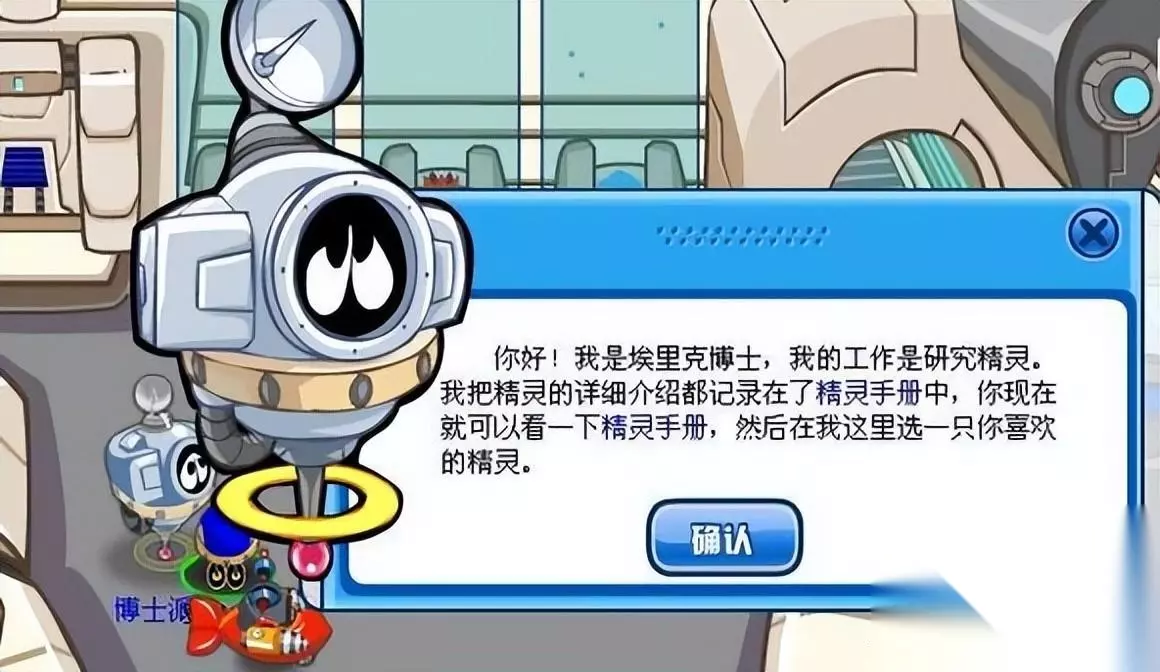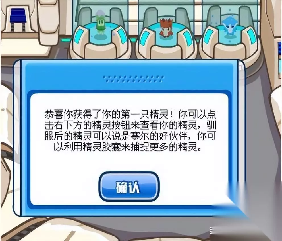 然后去“实验室”。实验室主要是用来买精灵道具的。跟博士说话,他向你介绍“赛尔精灵”的内容,并叫你查看《赛尔精灵》,之后就可以选择一只自己喜欢的初始精灵饲养了。