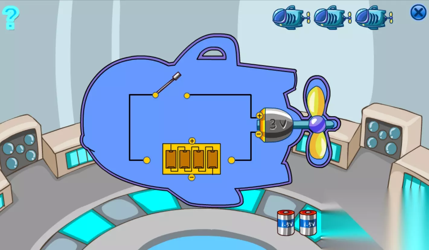 第一步把电池拖进电池格,虽然是有四个电池,但是只能拖两个电池进去,不然太多电会烧坏马达。第二步把电线接入电池格那(有两种方法,都试一下,反正有三次机会嘛~呵呵)。第三步点一下金属条形状的开关,接通完成!得到潜艇套装。
