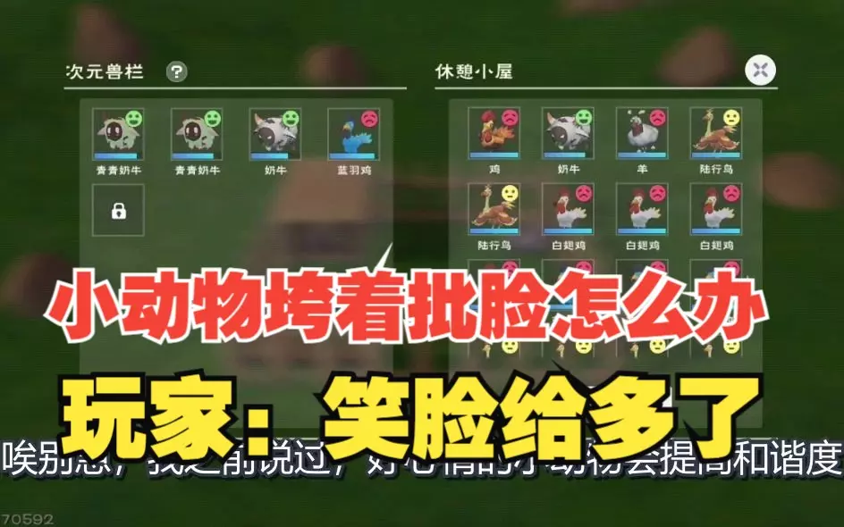 寿命:动物的工作时长,耗尽时会消失。越稀有的动物寿命越多,能产出更多资源。 心情:每种动物每天会随机变脸,共有红、黄、绿三种。 红色的千万不要养,会以极快的速度减少饱腹度和和谐度。见到后直接放回休憩小屋(最多150格)中等第二天心情改变(也有可能不变)。 心情改变是在每天第一次打开兽栏的瞬间变化,所以不用太担心半夜没看心情导致第二天双条清空。黄色的和绿色的可以养,绿色的产出效率更高。