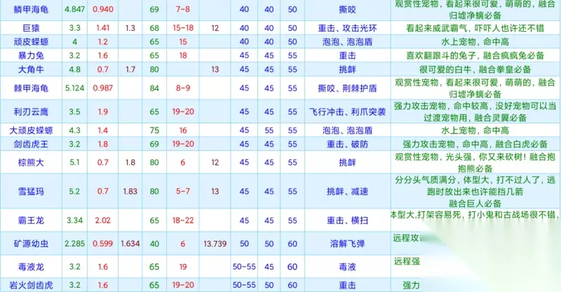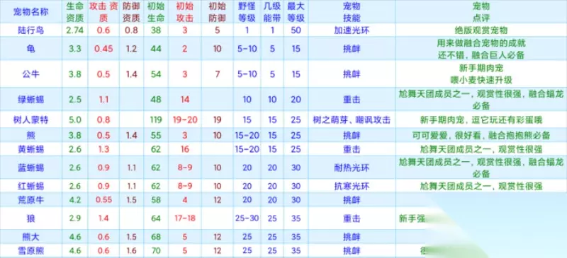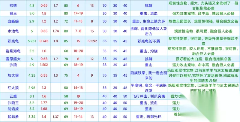 创造与魔法宠物资质大全最新2024 游戏中宠物非常多样,无法一次性用文字描述,特意准备了宠物资质大全图表,图表中包含:陆行鸟龟、公牛、绿蜥蜴、树人蒙特、熊、黄蜥蜴、蓝蜥蜴、红蜥蜴、荒原牛、狼、熊大、雪原熊、棕熊,狼王、血蜥蜴、水池龟、彩壳龟、岩浆海龟、雪原熊、大沙狼、灰太狼....等等宠物资质信息,其它宠物资讯看仔细查看图片了解! 注意:通过双击图片,可以查看高清大图!