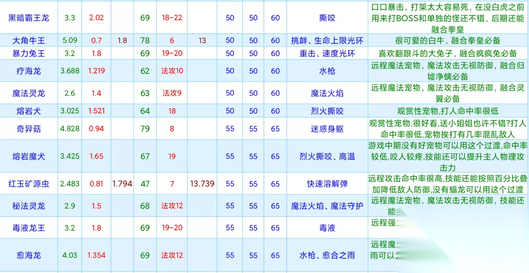 相关内容:创造与魔法宠物融合表2022最新 上方的更多宠物资质大全正在整理中,更多的宠物资质信息关注233乐园网了解查看! 创造与魔法宠物资质排行榜 1.毒液龙 毒液龙属于攻击宠,45级可以使用,毒液龙满资质1.5 攻击初始18~19。虽然最高资质1.5在攻击宠里不算很高但是毒液龙是唯一一个可以远程攻击的战宠,远程攻击的优点就是不会卡走位,而且毒液龙的技能毒液最高可以叠加5层,非常强力,最重要的是毒液龙是小怪,一级升级经验只需要2500,而且毒液龙有着55级最高等级上限,好养活,而且战斗力不凡。
