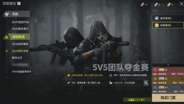 5V5夺金对峙港,同样三档门票不同奖励,对峙港的铁血2V2直变团队5V5全员合作更刺激,感受新地图带来的全新体验