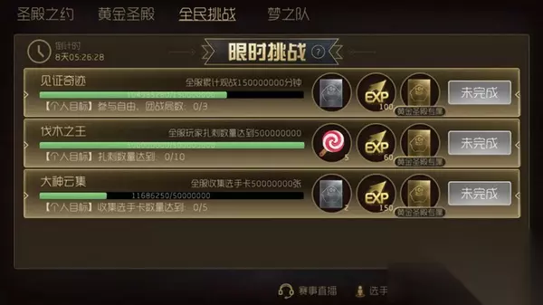 全民挑战规则 1、个全民挑战任务都包括一个全民目标和一个个人目标,在全球玩家共同努力达成了全民目标后,如果你也达成了个人目标,就可以领取丰厚奖励了。 2、挑战有任务计时,如果超时,挑战就失败了,大家要共同努力哦~ 3、全民挑战任务达成后,激活黄金圣殿的勇士可以额外领取一份专属奖励,注意,激活黄金圣殿后,还可以补领已经完成的全民挑战额外专属奖励。 本次全民挑战活动时间:7月3日-7月12日 活动详情如下图