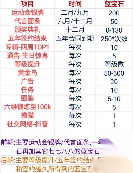 宝石获取: 专辑:粉丝通告:粉丝礼物/建房材料演唱会金币/经验/紫宝石 岀现活动如退团或负面消息等情况重启游戏可直接略过 每次演唱会和赶通告后游戏时间会过1个月 运动会金牌+100蓝宝石,银牌+200蓝宝石,铜牌+50蓝宝石 用蓝宝石抽练习生建议打开抽6回可节省50%蓝宝石