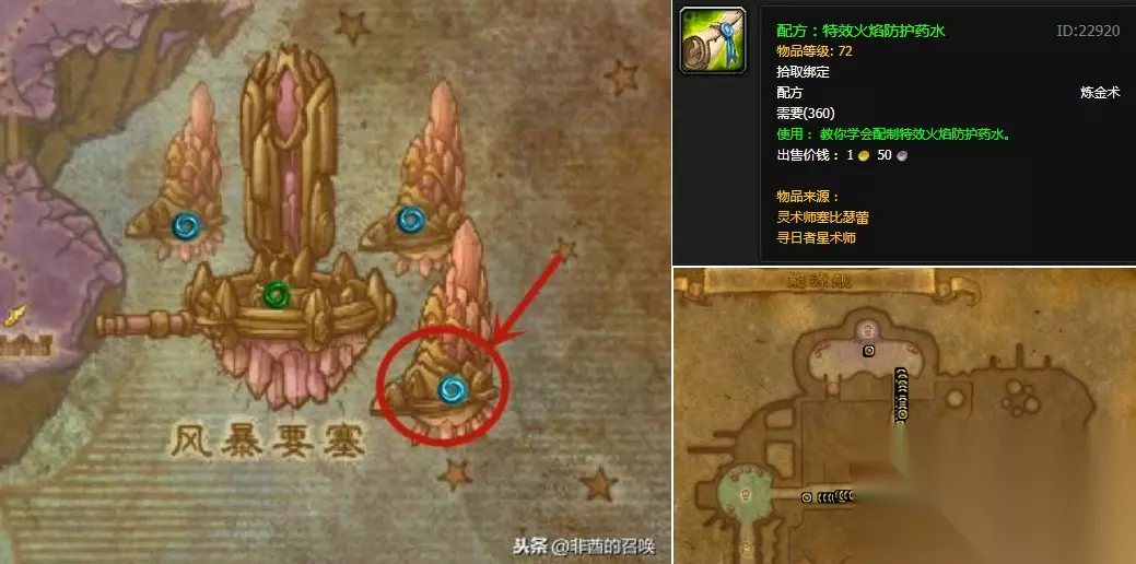 获取的方法需要玩家,去筹备各类特效防护药、变身道具、小宠物,然后穿过各种防盗门、拜访各位香堂堂主,脑洞大开的解谜,途中失误一步,就得重新来过,真的是又累又麻烦。 正文: 一、材料篇 以下防护药水,如果AH能购买到最好,一定要在公会或者同服务器的基友询问,查看他们是否以前学过的或者有剩余的药水,小编询问一圈下来,就差2个,整整刷了一天才凑齐。 1、特效火焰防护药水 药水配方获取方式:外域·能源舰4号BOSS【灵术师赛比瑟蕾】掉落的特效火焰防护药水-配方,PT模式下可无限刷(4%掉率)。 魔兽数据库中,显示通往5号BOSS的路上,【寻日者星术师】小怪也有几率掉落。